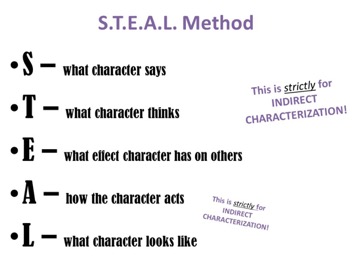 I’ve learned that characterization can be shown as the acronym “STEAL” this acronym stands for speech,  thoughts, effects on others, actions and looks. Those five things help find characterization because by analyzing the characters and looking for those things you can see the way they act and there true nature. For example, if you use speech you can read/listen to what a character is saying and from there gather what type of person they are. The word describing a character must always be an adjective. When finding characterization you must look for textual evidence that proves that the character is how the way you describe. You must also evaluate the character throughout the story and not just in the beginning because as story lines progress so do the characters.
